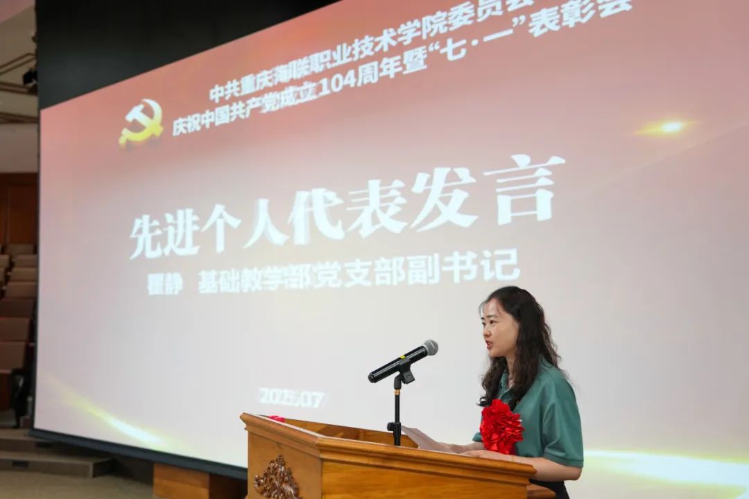 基础教学部党支部副书记瞿静作为先进个人代表发言。她对党组织和同志们的信任与支持表示感谢,并深刻认识到“优秀党员”这份荣誉背后所承载的重大责任。她以今年“七一”习近平总书记带领全国党员重温入党誓词为切入点,分享了自己作为一名教师党员在岗位上如何践行初心和使命的思考。她希望,全体党员教师以责任之心,履行教育职责;以真诚之心,做好模范表率;以平常之心,专注做好身边事,在平凡的教师岗位上做出不平凡的事业。