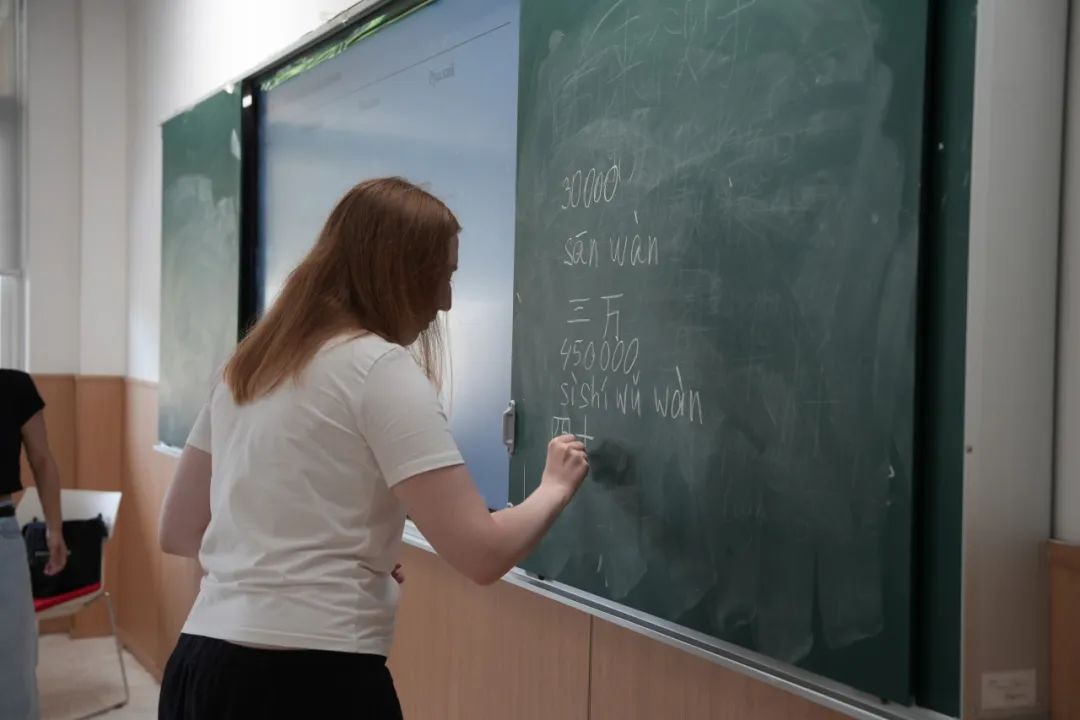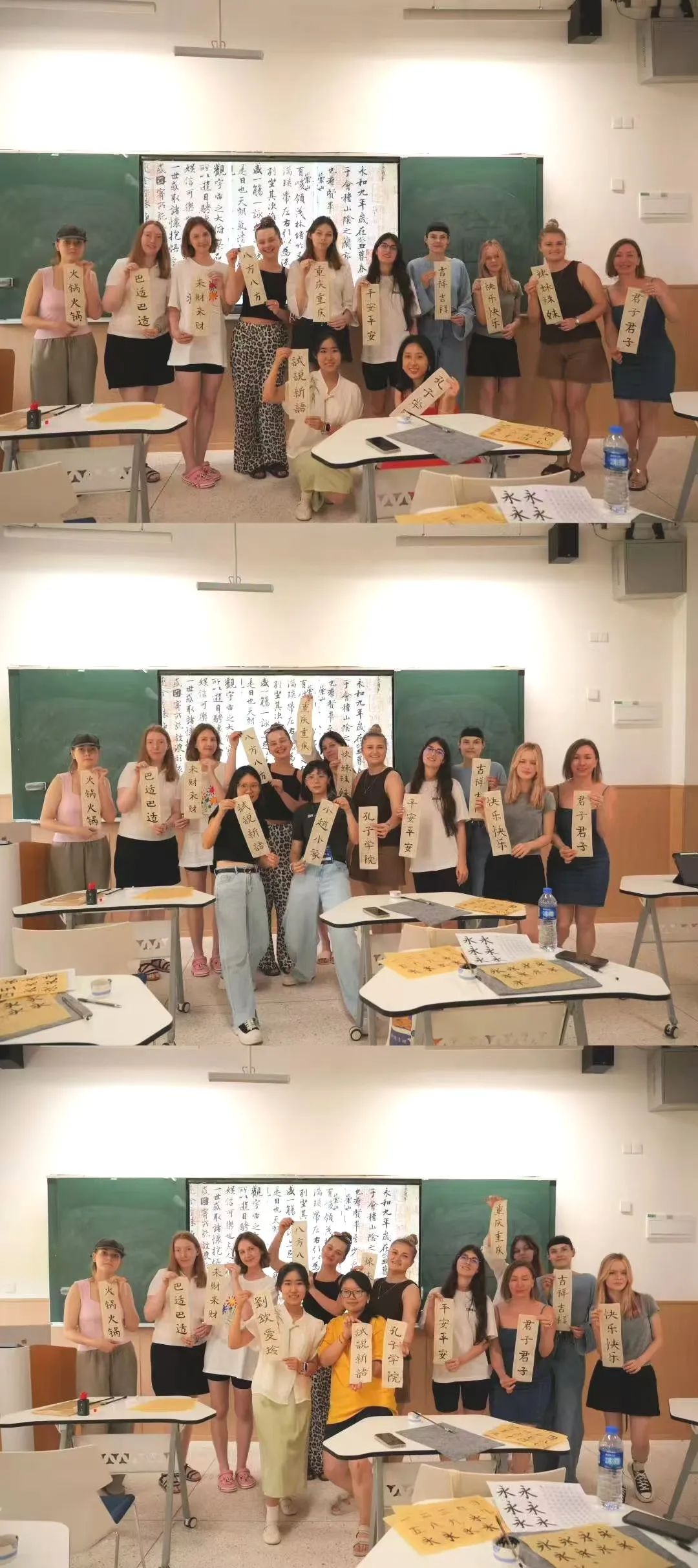俄罗斯学生们用毛笔写下“中俄友谊”