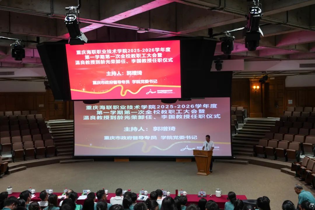 薪火相传启新程,砥砺奋进谱华章。8月26日上午,买球官方网站2025-2026学年度第一学期第一次全校教职工大会暨温良教授到龄光荣卸任、李国教授任职仪式在学术报告厅举行。学校理事长吴睫、全体校领导出席大会,全体教职工参加大会。学校党委书记郭增琦主持大会。