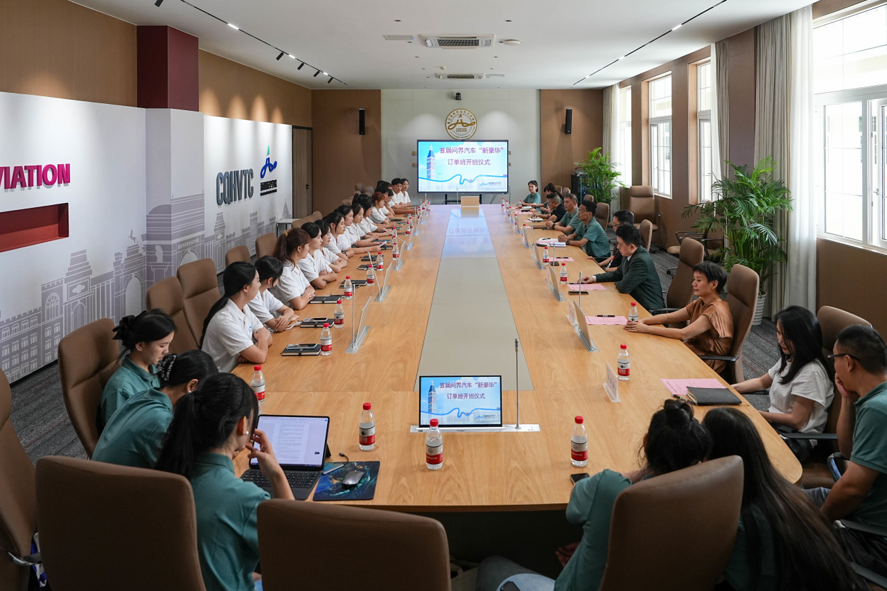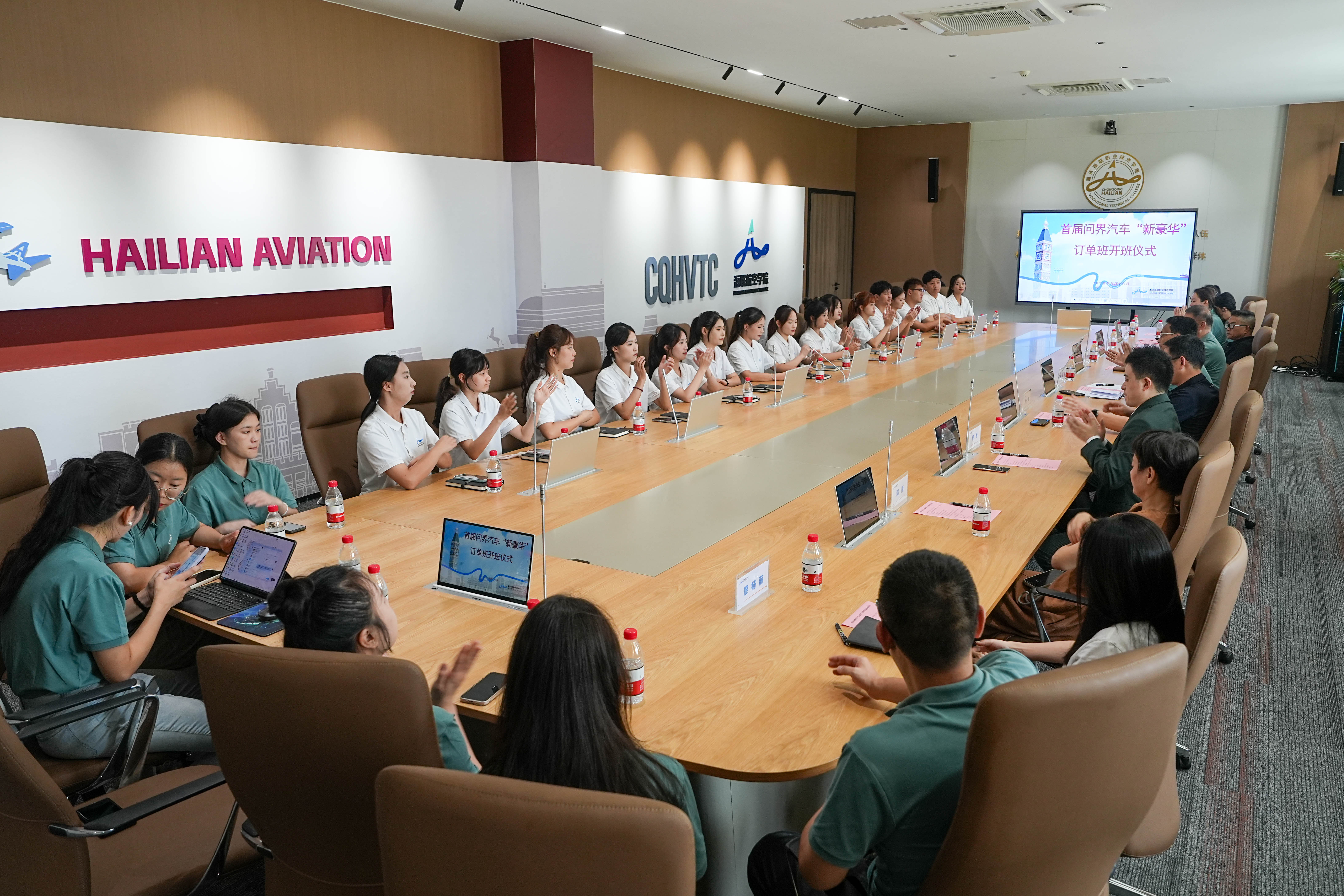 9月16日,首届问界汽车 “新豪华” 订单班开班仪式在买球官网T1教学楼第一会议室举行。问界汽车国内销服体系培训部部长刘先健、国内销服体系交付培训经理唐彬,买球官网校长李国、常务副校长李慧民出席仪式,校企合作处、教务处、就业处、空中乘务学院相关负责人以及订单班教师代表、全体学生共同参加仪式。仪式由空中乘务学院院长陈洁主持。