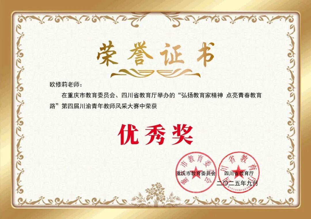 近日,重庆市教育委员会、四川省教育厅公布第四届川渝青年教师风采大赛获奖名单,代表买球官网参赛的欧修莉老师榜上有名,获高校组优秀奖。