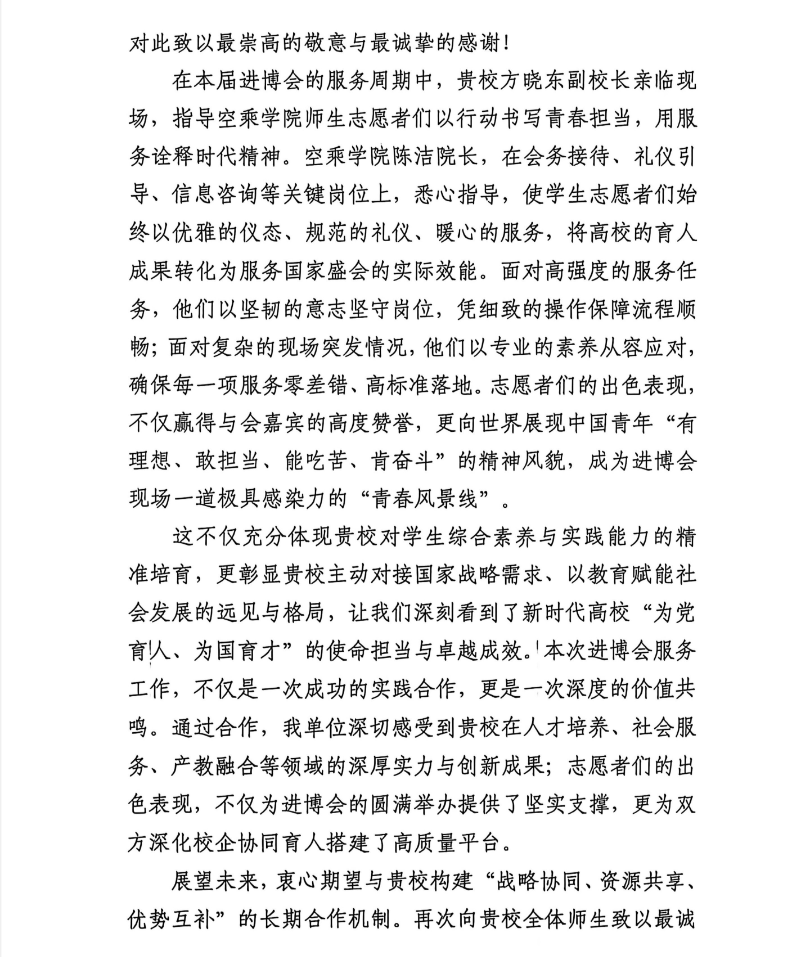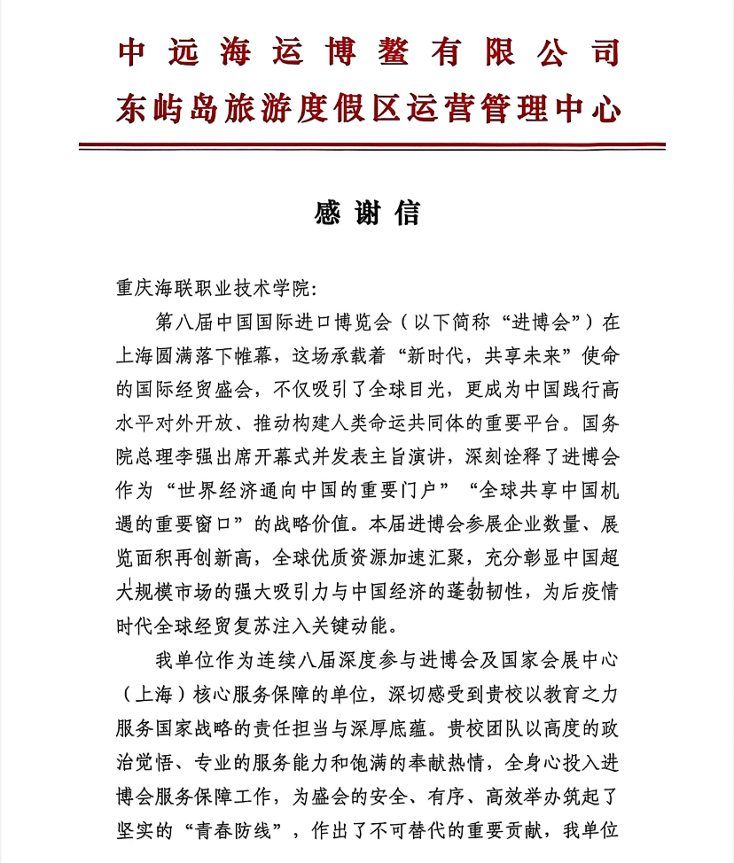 近日,买球官网收到中远海运博鳌有限公司东屿岛旅游度假区运营管理中心发来的感谢信,对买球官网学子在第八届中国国际进口博览会服务保障工作中的突出贡献予以高度赞誉。