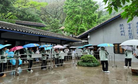 细雨纷纷洒落,仿佛是革命先辈们看到如今幸福生活时, 欣慰又饱含深情的泪水,交织着往昔的艰辛与今朝的安宁,同学们热情高涨、冒雨前行,无畏风雨艰难, 在历史与现实的碰撞中深化民族团结意识,厚植爱国主义情怀。
