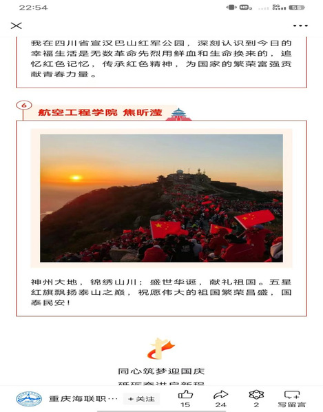101日至3日,学院组织学生参加返家乡活动,写诗,回家乡红色地标拍照打卡,航空工程学院航地专业两名同学上榜。
