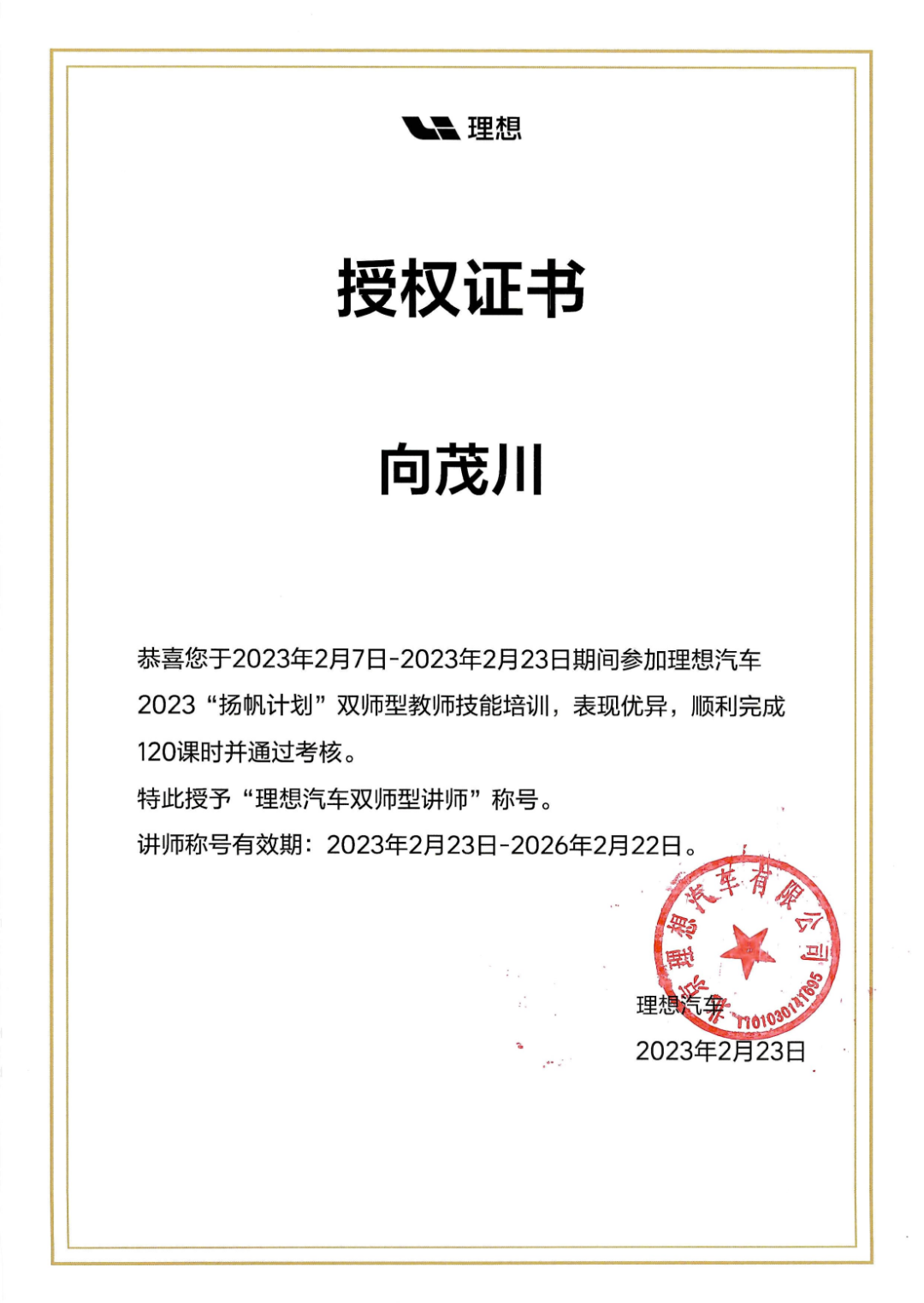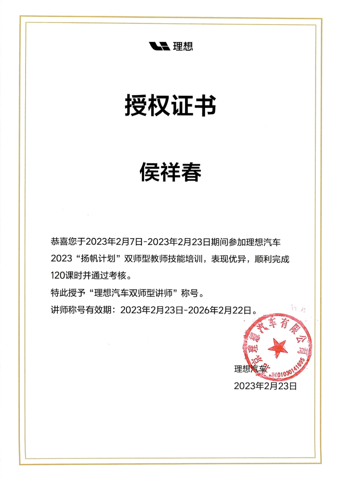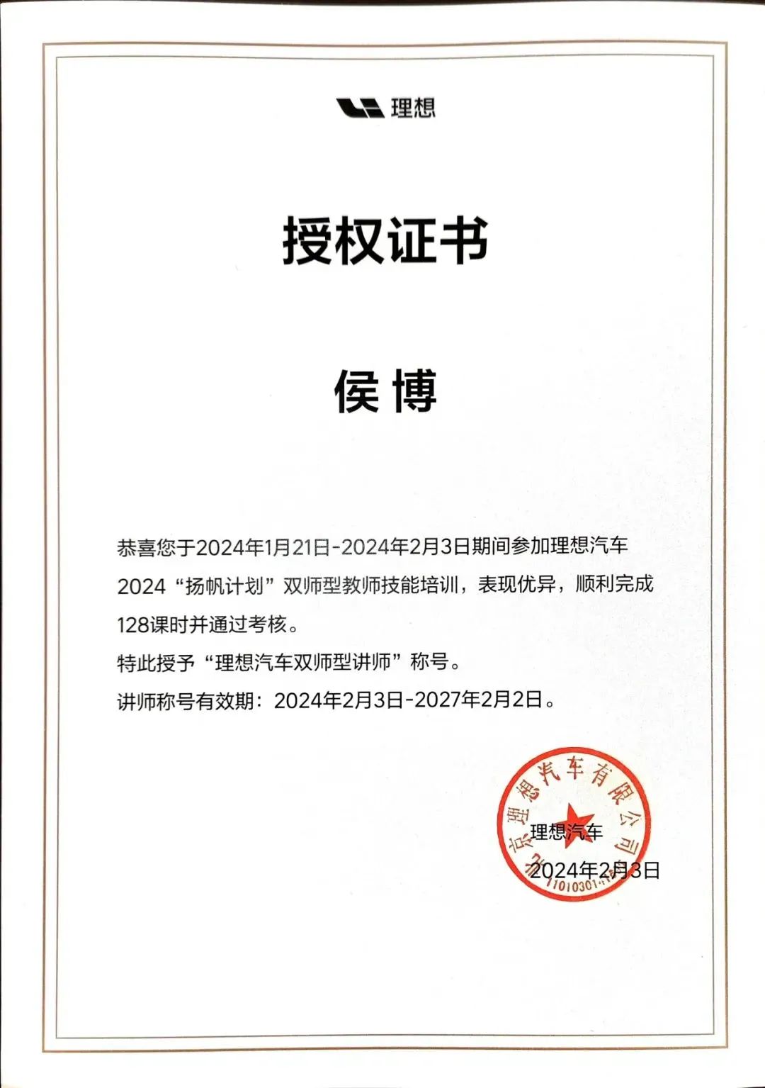 买球官网教师被授予“理想汽车双师型讲师”称号
