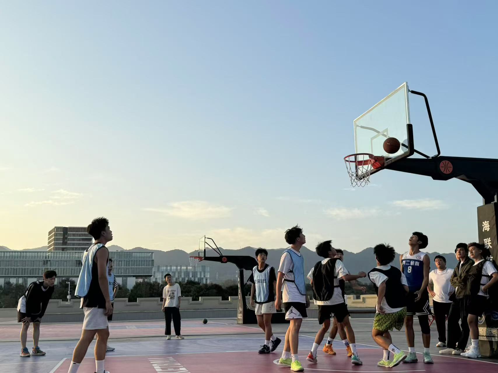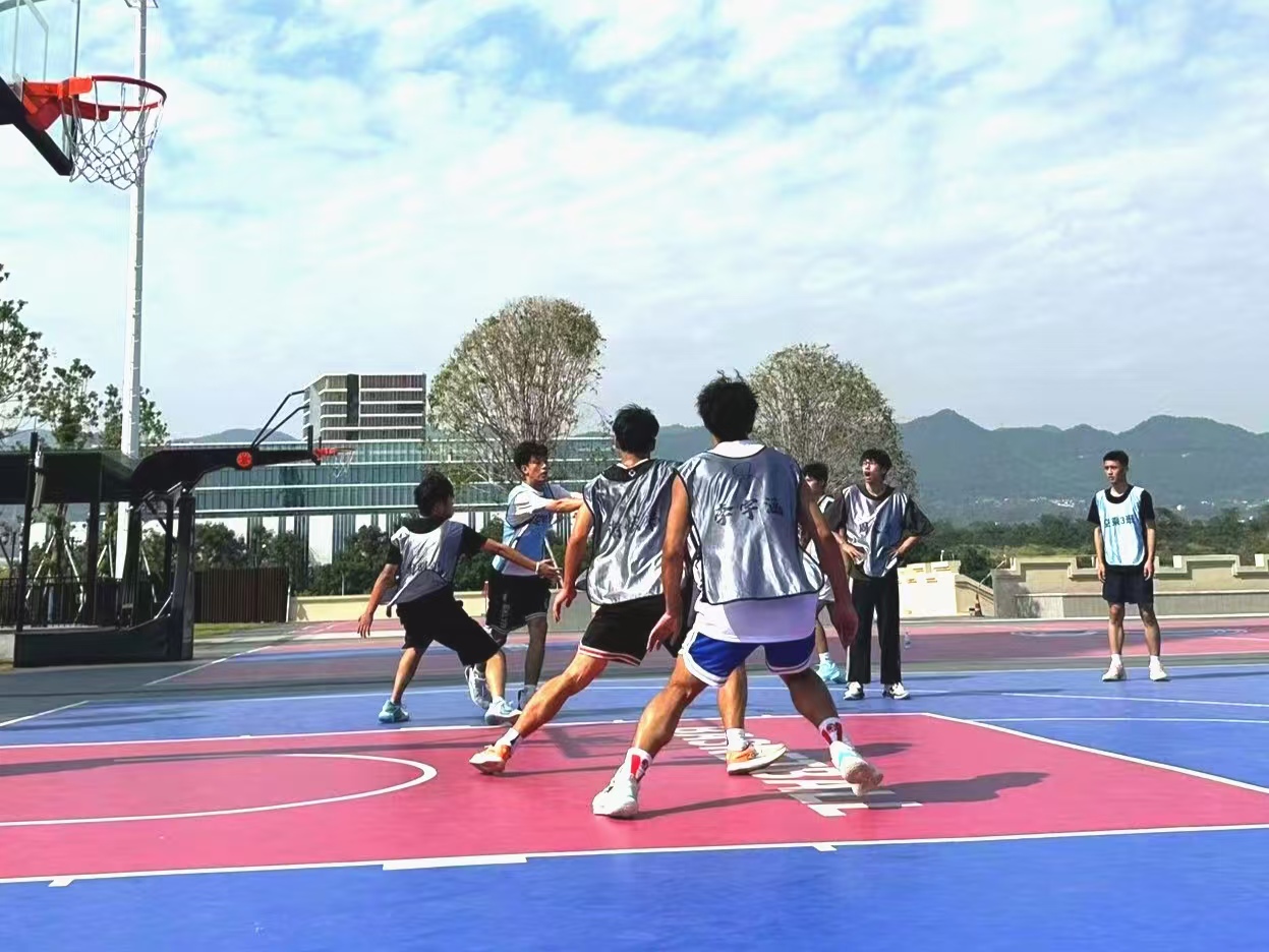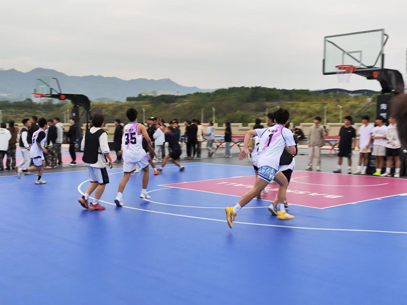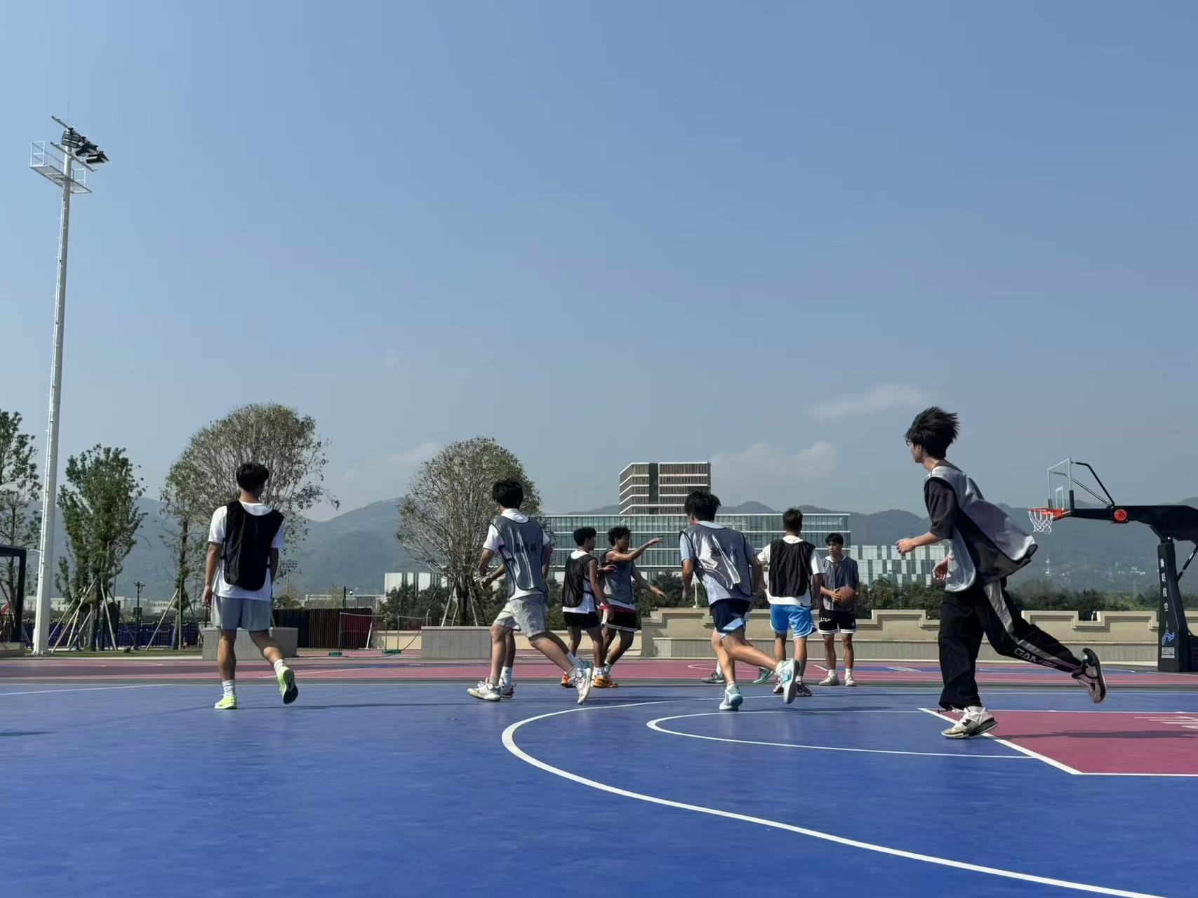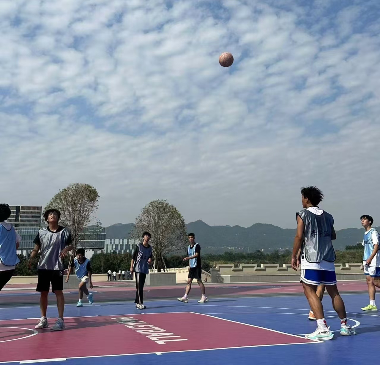 篮球场上,同学们挥洒汗水,展示着自己矫健的身姿,迈着轻快的步伐奔跑的篮球场上。