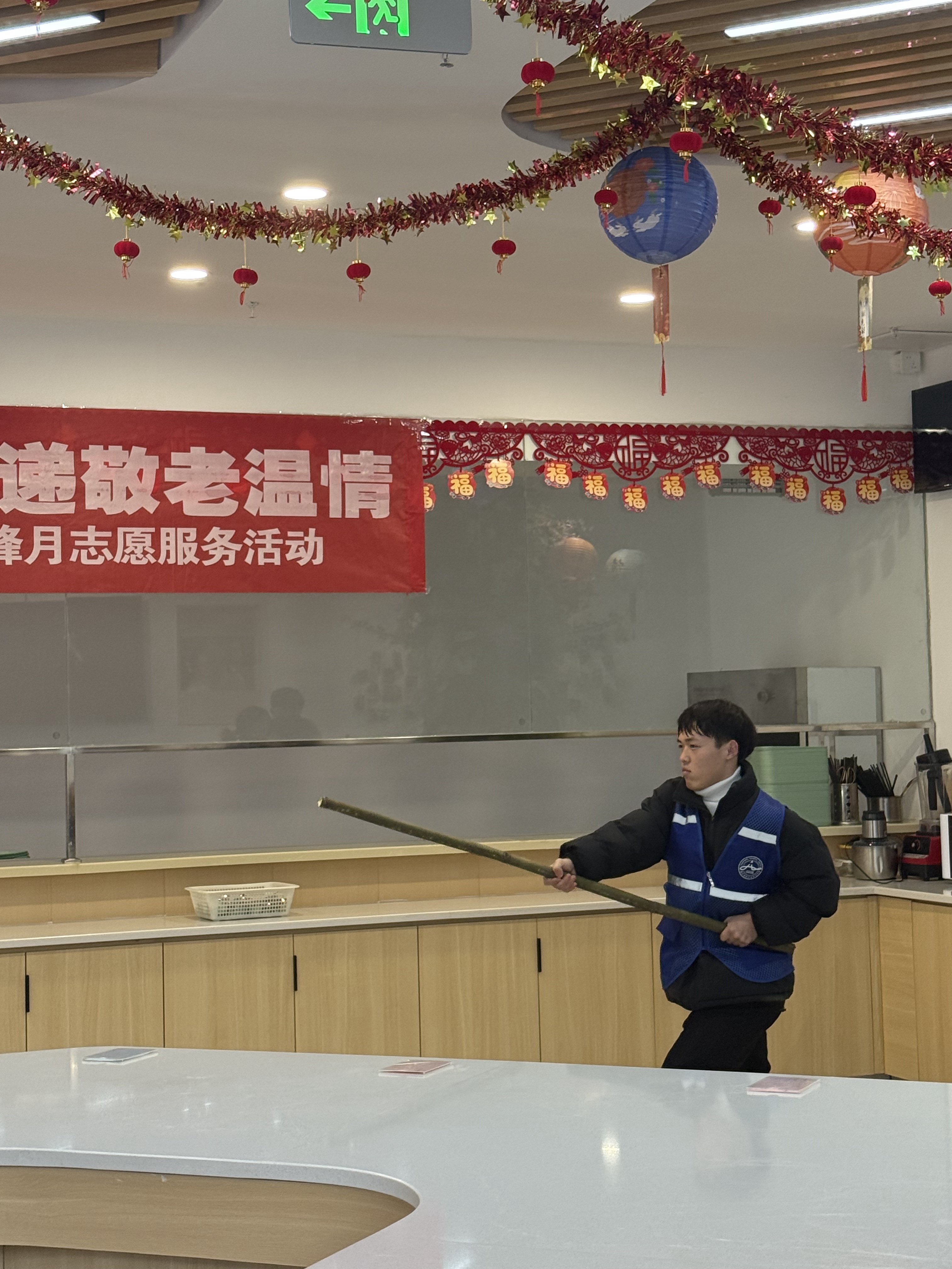 为弘扬雷锋精神,践行社会主义核心价值观,空乘学院的师生们走进佳阖颐养乐园,开展学雷锋志愿服务活动,为老人们送去温暖和关怀,志愿者们坐在老人们身旁,与他们亲切攀谈,话题从日常琐事自然而然地聊到往昔经历。大家你一言我一语,欢声笑语在敬老院的各个角落回荡,老人们的脸上也都洋溢着幸福的笑容。不仅如此,志愿者们还精心组织了丰富的文娱活动,带领老人们一同唱歌,现场气氛热烈。随后,精彩的棍术表演更是引得老人们阵阵喝彩,为敬老院增添了别样的活力与欢乐氛围 。