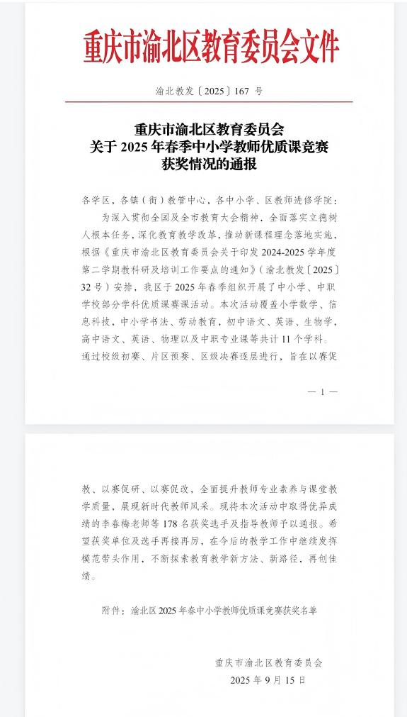 祝贺我院刘芳瑗老师在重庆市渝北区教育委员会2025年春季中小学教师优质课竞赛获得中职专业课一等奖