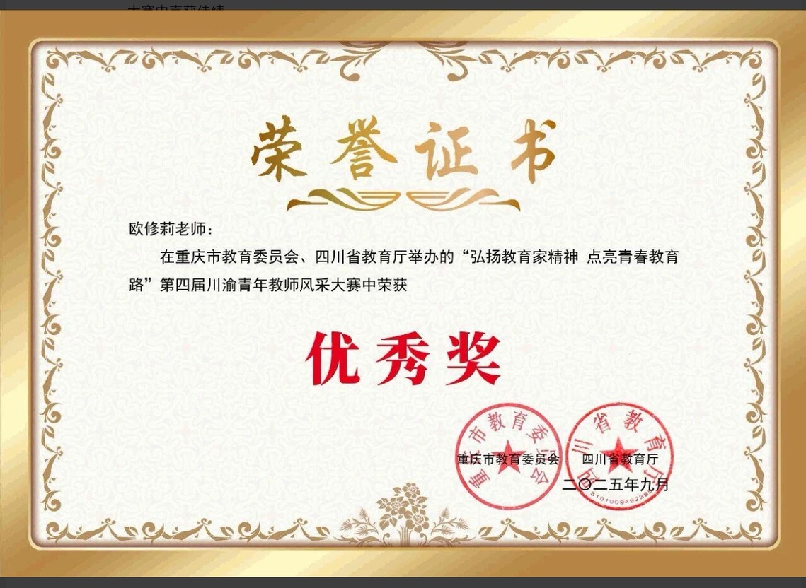 近日,重庆市教育委员会、四川省教育厅公布第四届川渝青年教师风采大赛获奖名单,代表买球官网参赛的欧修莉老师榜上有名,获高校组优秀奖。