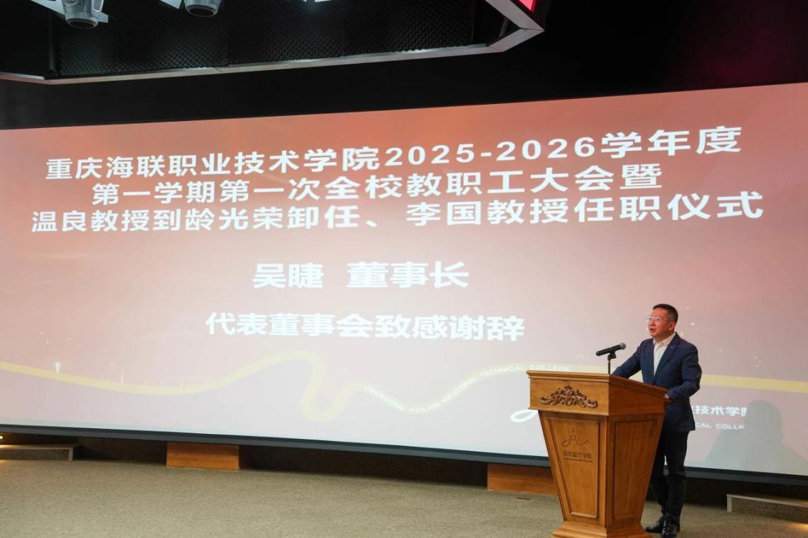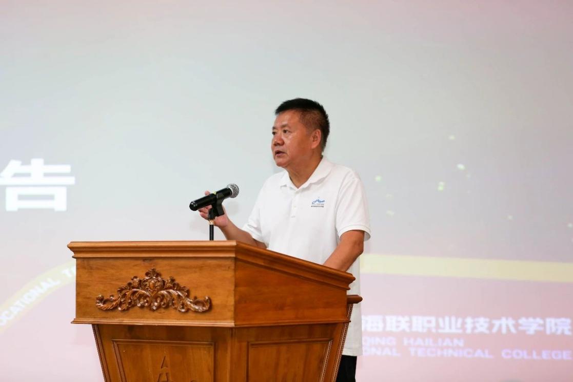 温良教授作卸任述职报告。他深情回顾了与海联共同成长的峥嵘岁月,并对学校未来发展致以美好祝愿。他衷心感谢市政府、市教委,吴睫理事长、全体校领导及教职员工的鼎力支持。“莫道桑榆晚,为霞尚满天。在海联的这些年,是我教育生涯中最为珍贵的时光。”他表示,卸任不卸责、离岗不离心,将一如既往关注、支持海联学院高质量发展。