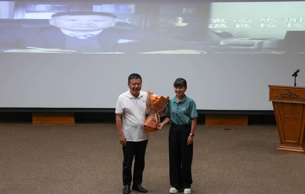 教职工代表、携程文旅产业学院董颜宏老师上台发言,表达了全体教职员工对温良教授的感激与祝福,并献上鲜花,场面温馨感人。