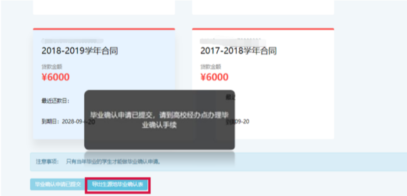 点击左侧“毕业确认申请”,再次核对个人基本信息、联系方式、贷款情况等信息,确认全部信息都填写无误后,点击最下方【毕业确认申请】。