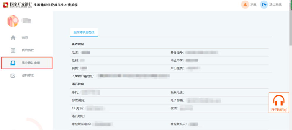 点击左侧“毕业确认申请”,再次核对个人基本信息、联系方式、贷款情况等信息,确认全部信息都填写无误后,点击最下方【毕业确认申请】。