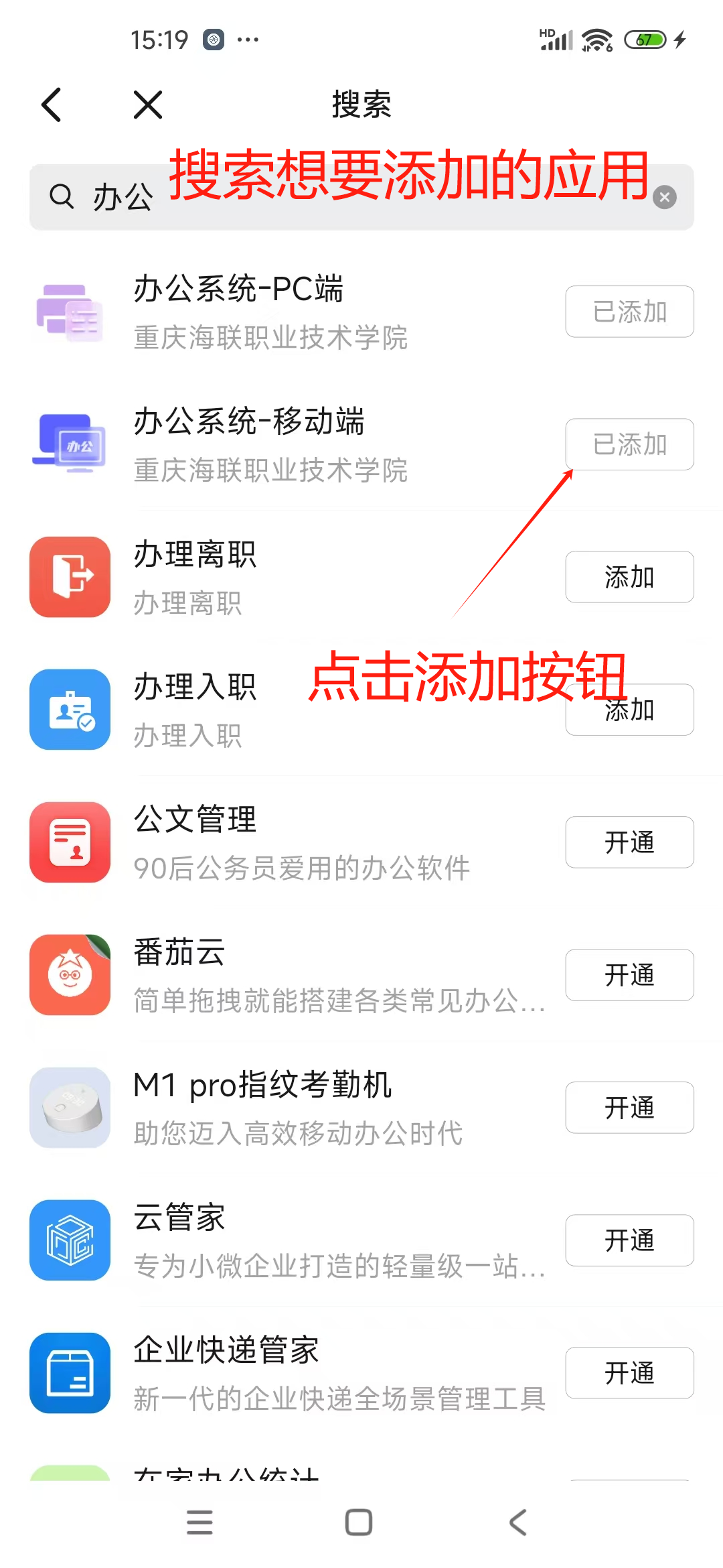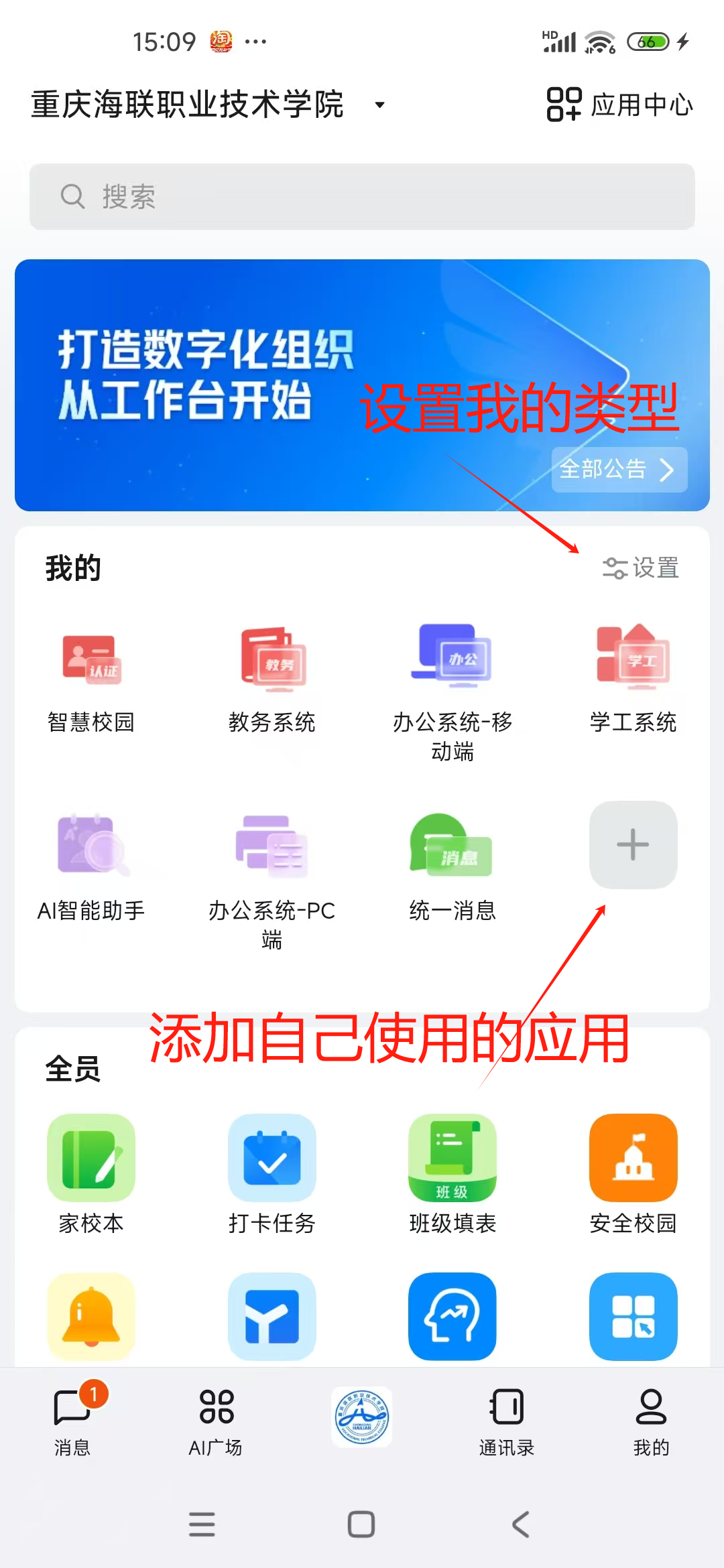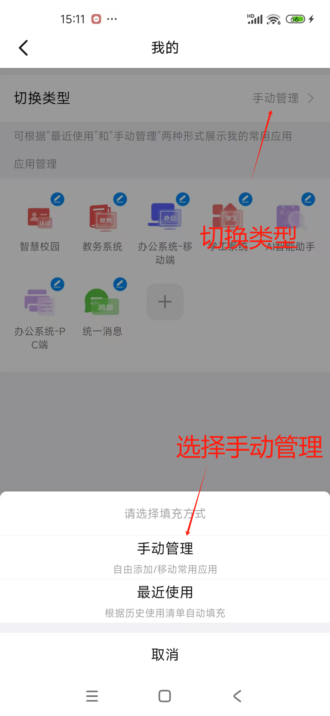 在应用页面中的我的页签,点击设置,切换类型为“手动管理”,然后回到我的页面,点击“+”号,添加自己使用的应用,包括:智慧校园门户、办公系统、学工系统、教务系统、AI智能助手等。如下图所示: