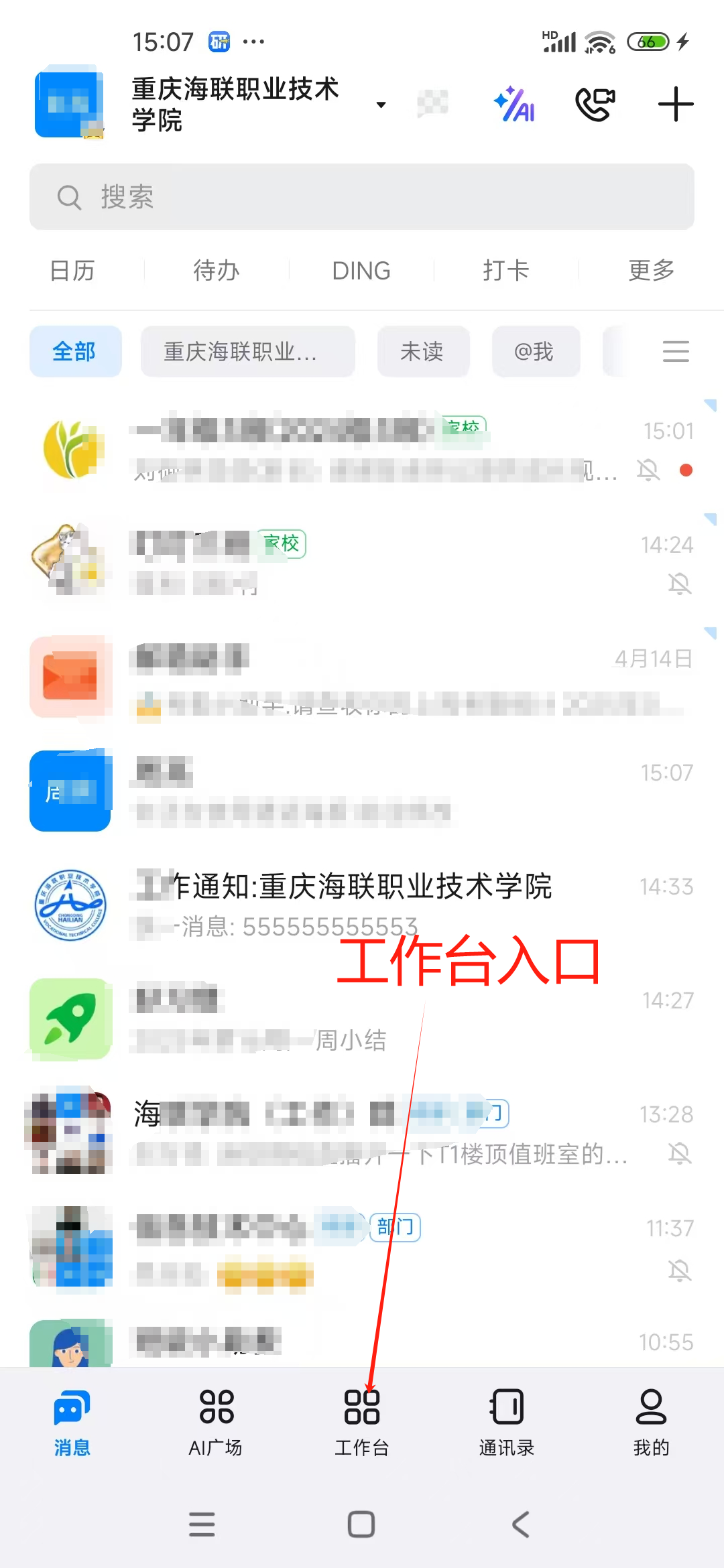 1、登录钉钉,点击下方“工作台”,进入应用页面,如下图所示: